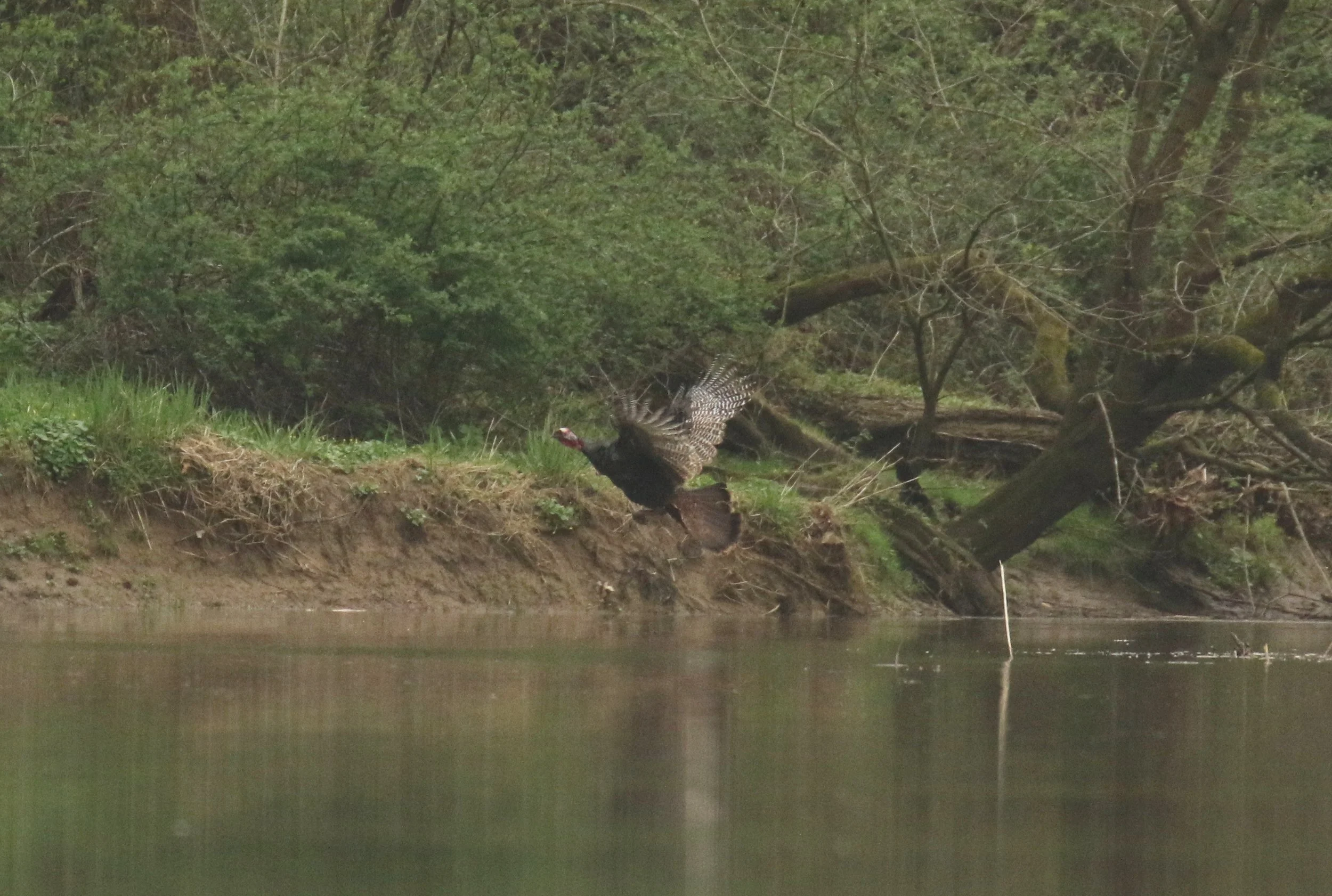 Wild Turkey in flight by the creek